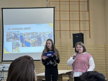 Die vier Projektgruppen – Schreinerei, Werkraum, Reporter:innen und Hauswirtschaft – stellten ihre Arbeiten vor. Sie erklärten, wie die Möbel gebaut wurden, wie wir journalistisch gearbeitet haben und wie die Hauswirtschaftsgruppe alle Beteiligten mit leckerem Essen versorgte.