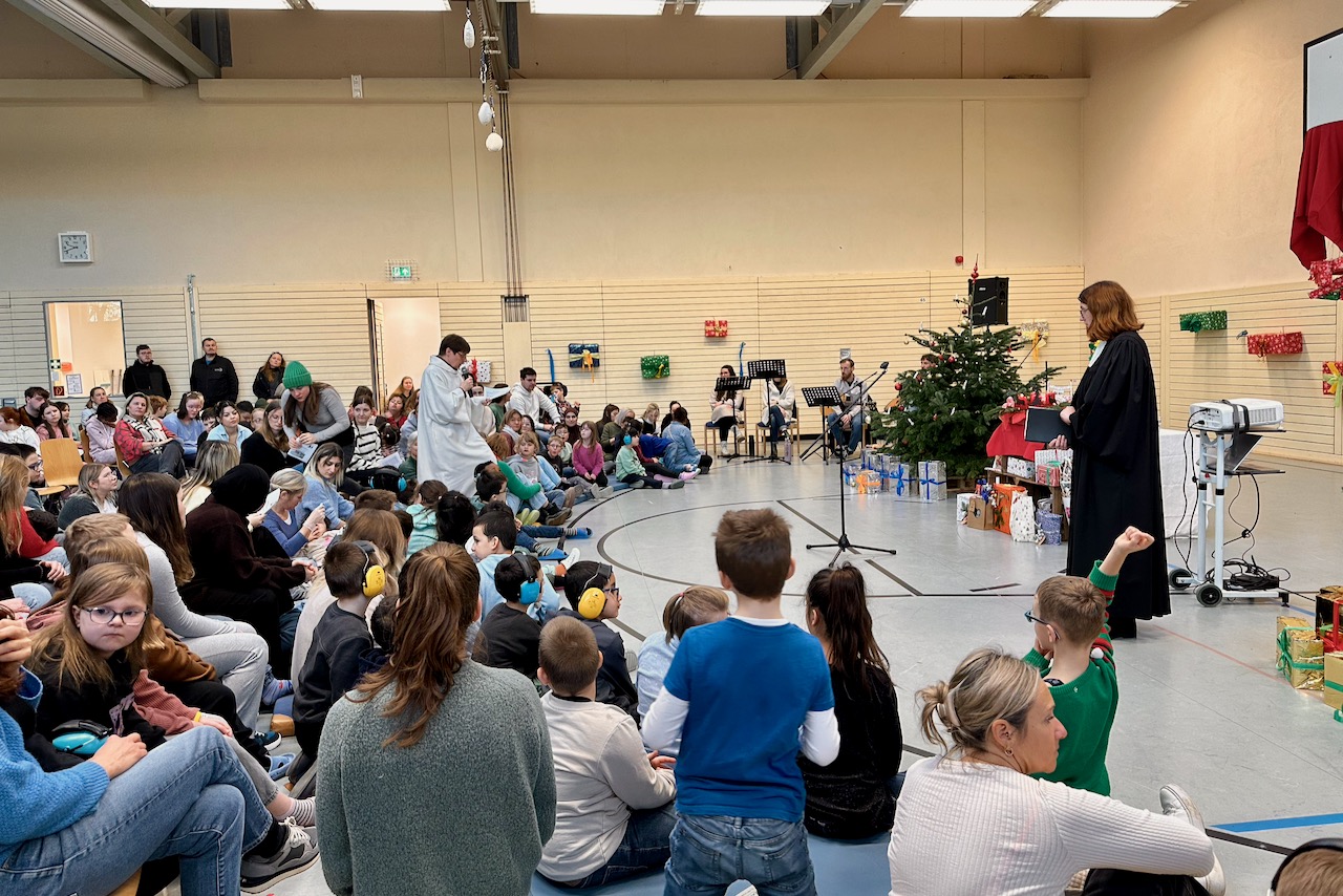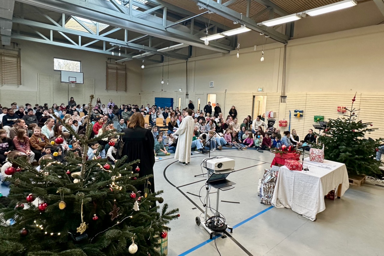 Etwas später hatten wir unsere Weihnachtsandacht in der Schule. Diese war diesmal zum Thema Schenken gestaltet. Wunderbar vorbereitet von den Unterstufenklassen sowie der evangelischen Pastorin Frau Voldrich und der katholischen Seelsorgerin Frau Werner wurde allen schnell klar, es gibt Geschenke zum Kaufen, aber auch Geschenke, die man nicht kaufen kann und kein Geld kosten, wenn man sie verschenkt. Und sie sind die wichtigsten Geschenke, die man bekommen kann: Gemeinsame Zeit verbringen, miteinander spielen, gegenseitig Vertrauen, Hilfe bekommen, Liebe erhalten, …