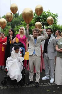 Am 27.6.2024 war es endlich soweit. Die Premiere des Theaterstückes „Das Fest im Römerturm“ wurde vor der Schulgemeinschaft als ganzes Stück aufgeführt. Hierbei finden Jugendliche, die den alten Römerturm als geheimes Versteck nutzen, einen alten Koffer mit Kostümen und beschließen, ein Theaterstück zu spielen. In diesem Theaterstück soll das Fest im Römerturm gefeiert werden, zudem die königliche Familie alljährlich einlädt. Doch diesmal kommen die zwei Schwestern der Königin, die sich der schwarzen Magie zugewandt haben, mit dem Höllenhund ins Schloss und versetzen die feiernde Gemeinschaft in einen Dornröschenschlaf.